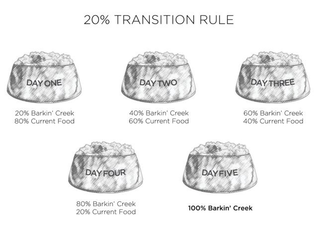 To ensure a smooth transition, we recommend the 20% Transition Rule and suggest transitioning over a period of 5 days. If your dog has a sensitive stomach, the transition may take 7-10 days (adjust percentages accordingly).